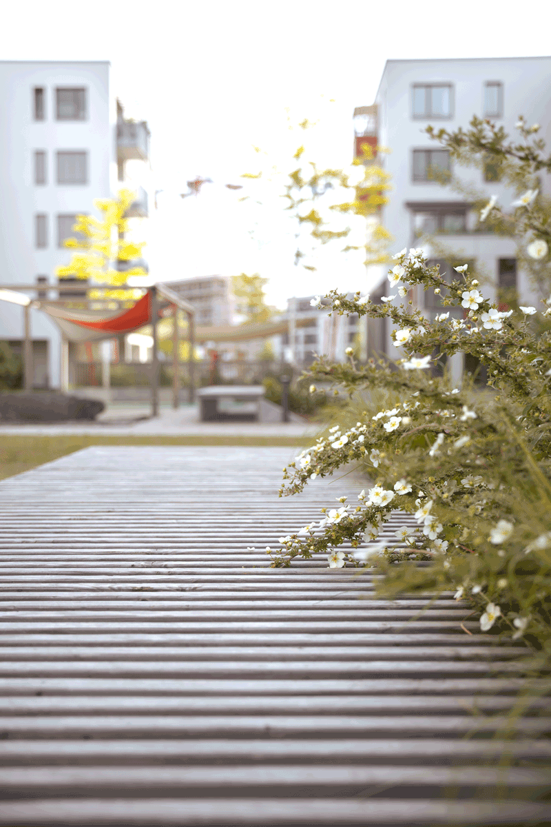 Über die Jahre hat sich auf dem ehemaligen Güterbahngelände in Freiburgs Norden eine reiche Ruderalflora eingestellt. Diesen besonderen Charme von spontaner Wildnis fängt der Entwurf für die Freianlagen zwischen zwei mehrgeschossigen Neubauzeilen ein. Die besondere Topografie, Schotter in verschiedenen Körnungen und Pioniergehölze prägen das Leitbild für den Innenhof mit Gemeinschaftsangeboten, Spielplatz und Kita-Garten.
