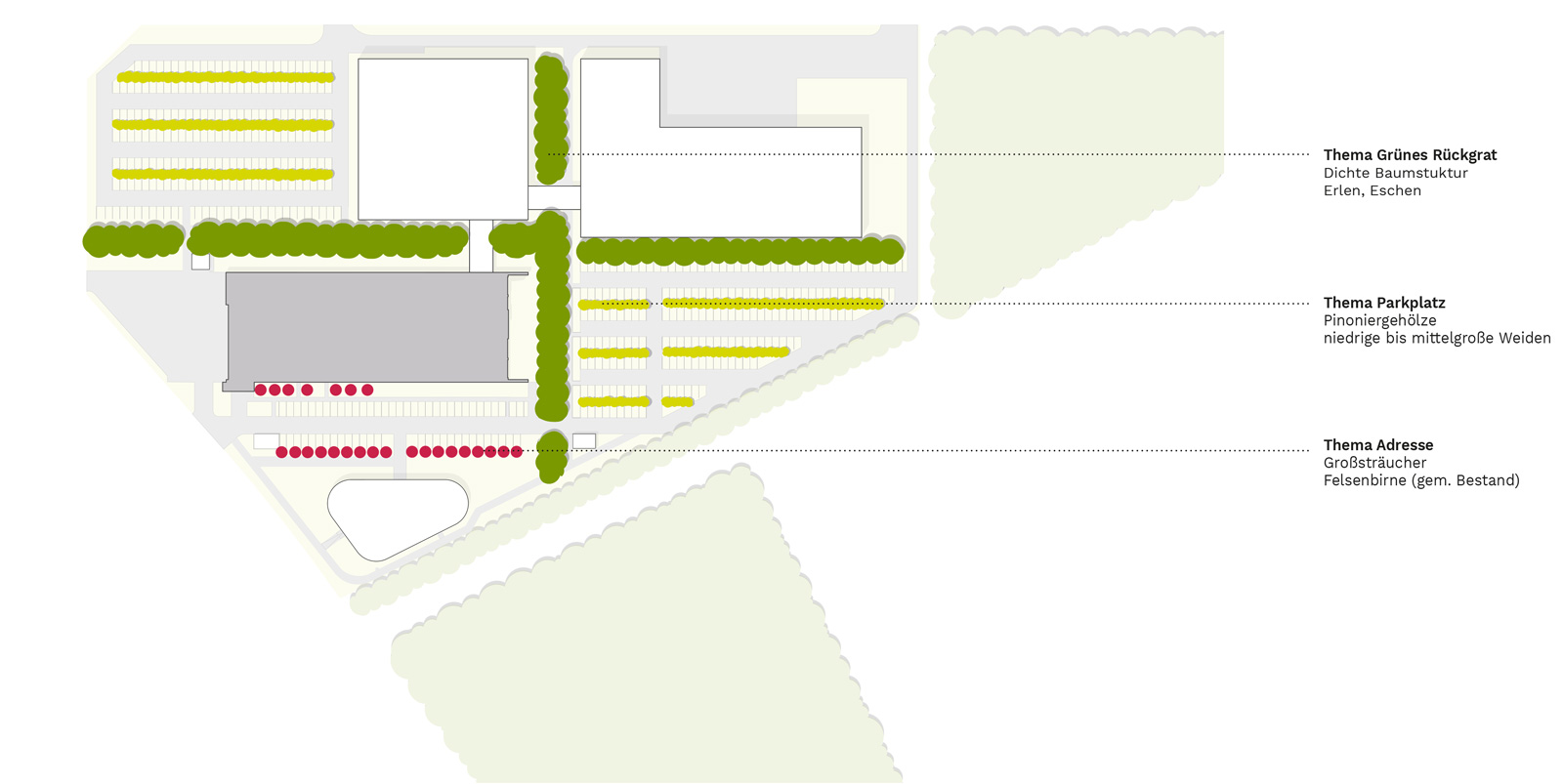 Das „Grüne Rückgrat“ bildet ein durchgehendes Band aus dichter Baumstruktur (Erlen und Eschen) und zieht sich wie ein vegetatives Gerüst durch das Areal. Es knüpft an bestehende Vegetationsfragmente an und vernetzt die innenliegenden Freiräume mit den umgebenden Grünflächen.