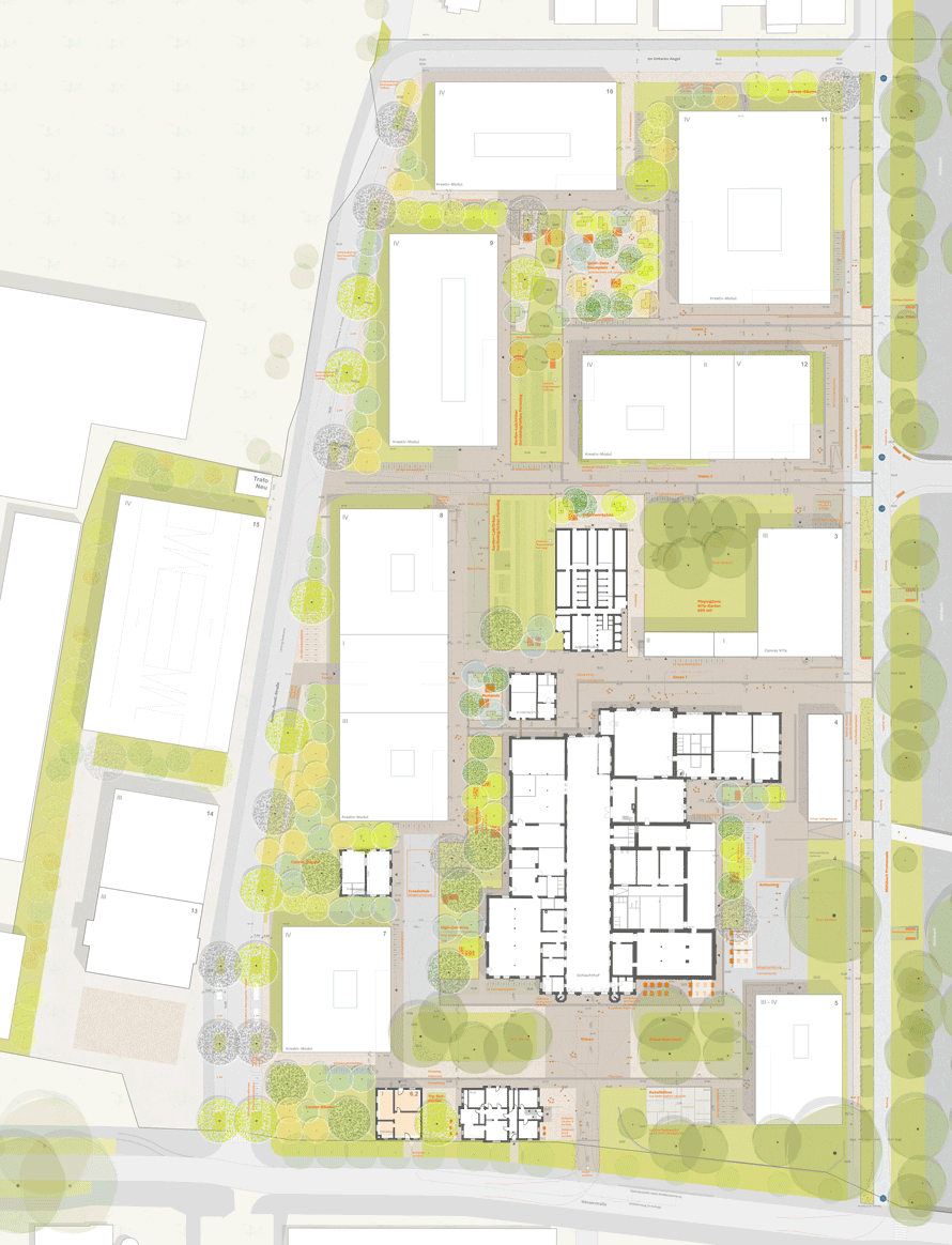 Neben dem Canvas-Belag spiegelt auch die Vegetation die Vielfalt und Robustheit des Ortes wieder: Es gibt Flächen mit Spontanvegetation oder Wiesenansaaten, die gleichzeitig auch der Regenwasserversickerung dienen. Ein junger, sich verändernder Wald, dient als Vorbild für das Gehölzkonzept: Pionierarten wie Birken, Zitterpappeln, Weiden, Erlen und Kiefern, ergänzt mit Ahorn- und Eichen-Bäumen werden in geringen Abständen und mit freier Anordnung gepflanzt. Zusammen mit der Fassadenbegrünung der Gebäude tritt das Areal dadurch von außen als junger grüner Wald, in Erscheinung.