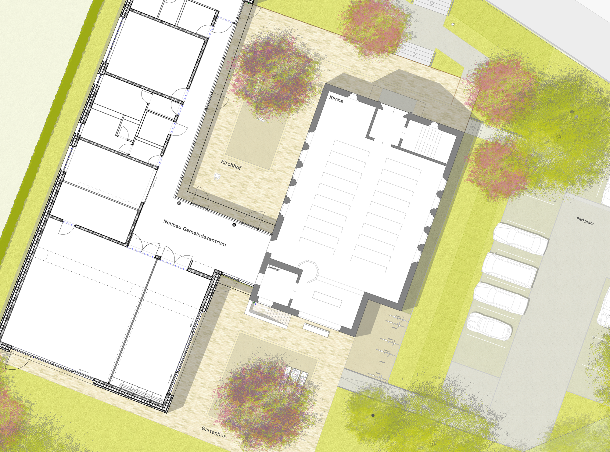 BestandssituationNeubau GemeindezentrumNeue PlatzräumeParkplatzZierkirschen als verbindendes Element