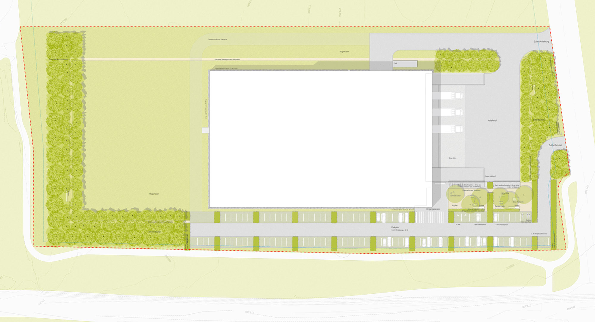 Paravents aus Ziergräsern strukturierene den Parkplatz, um die Sicht auf das Gebäude und Eingang nicht zu verdecken, die parkenden Autos aber zu verstecken. Sie erzeugen ein artifizielles Bild. Im Gegensatz dazu rahmt das natürliche, dichte Birkenwäldchen das Grundstück zur Straße hin. Den Übergang zur offenen Landschaft bildet die offene, extensiv bewirtschaftete Magerwiese, die zu einer neuen Heimat für z.B. Insekten werden kann.