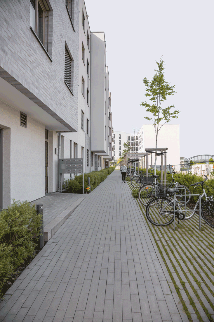Die außen an den Hauseingängen liegenden Fahrradstellplätze sind mit Rasenlinern befestigt, die sich wie die alten Bahngleise parallel zur Gebäudekante ziehen. Unterbrochen werden die Streifen von unregelmäßigen Pflanzinseln mit je einem Kleinbaum, einer Felsenbirne und einer Unterpflanzung aus Stauden.