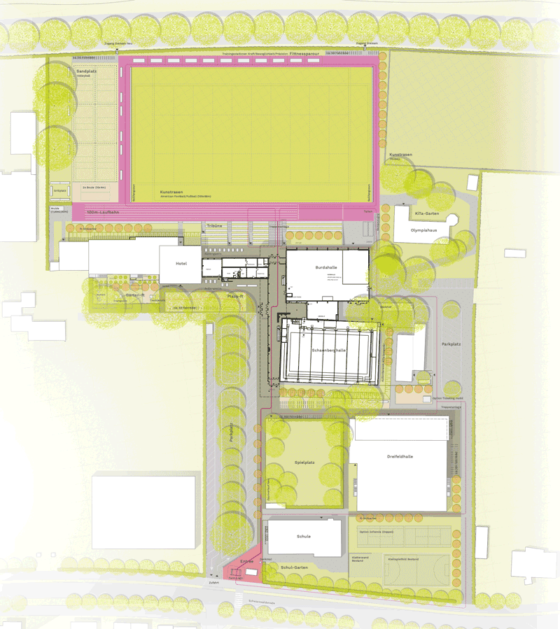 LeitideeSpielarena mit umliegender Laufbahn als neues charakteristisches Thema und Zentrum der aktiven MitteEinfassung der Arena im Norden und Süden über TopografieLaufbahn