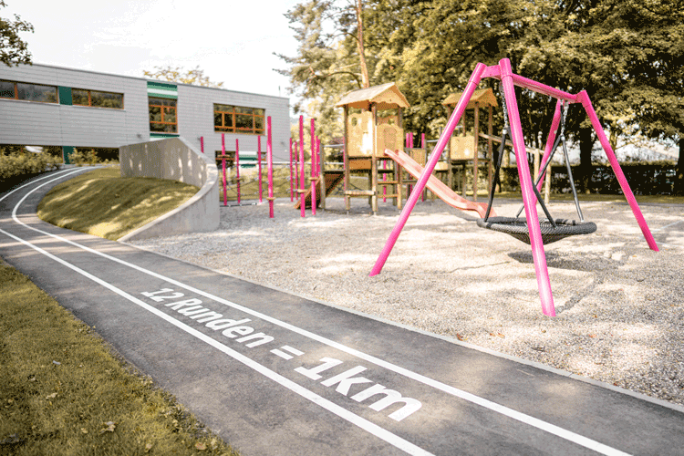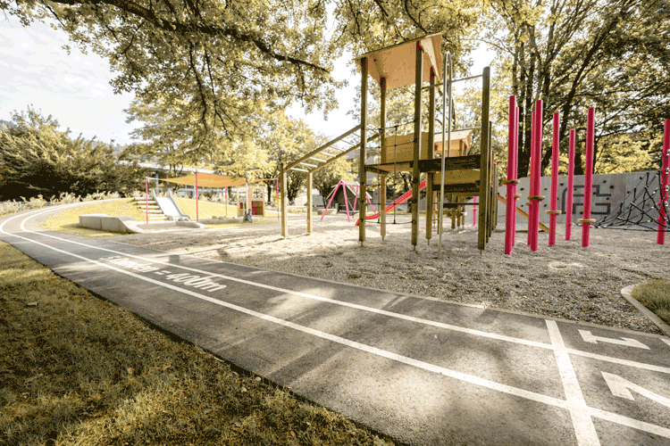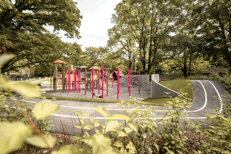 Eine Laufbahn umschließt die Mitte und kann mit dem Rad, Bobbycar oder den eigenen zwei Beinen genutzt werden. An den kurzen Seiten folgt die Laufbahn der ansteigenden Topographie und bringt Schwung in jedes Fahrzeug für den aktiven Spaß in der Dauerschlaufe. Die Topografie wird sowohl für die große Kletterwand und Hangrutsche genutzt und wird erlebbar. Eine dichte Bepflanzung aus Purpurweiden bietet nach außen einen Rahmen, räumlichen Schutz und Versteckmöglichkeiten.