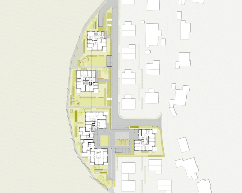 Konzept: Bestand heute - grüne Wiese…die grüne Wiese wird bebaut……die Wohnachse verbindet die Gebäude……die Wiese wird mit Rosmarinweiden zoniert……das Dachwasser versickert in Kiesbänken.