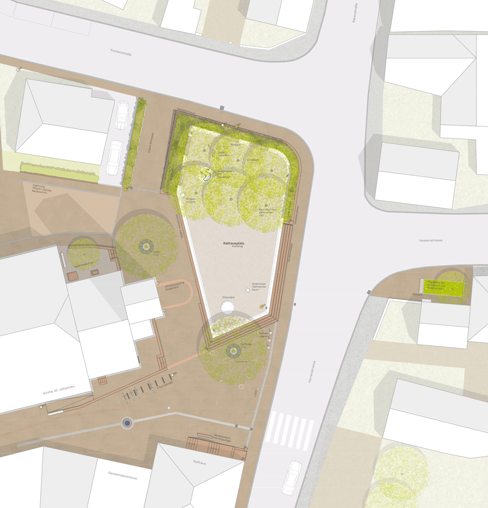 Der neue Kirchplatz liegt leicht erhöht und wird durch eine Sandsteinmauer, Höhe 40-55cm und einer Treppenanlage Richtung Herrenstrasse und Rathaus eingefasst. Im Norden zur Kronenstraße wird der Platz durch eine Hecke und ein Baumdach gerahmt und schafft einen räumlichen Abschluss. Die großzügige Treppenanlage nimmt die Achse der Kirchstraße auf und ermöglicht den Besuchern von fast allen Seiten den Platz zu betreten.