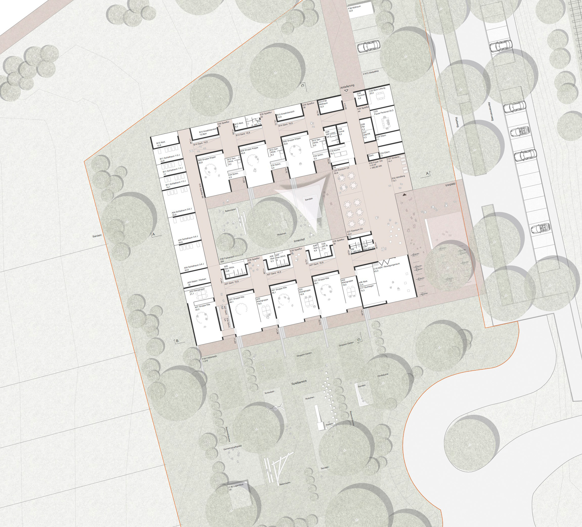 Die landschaftliche Gestaltung mit den kleinen Terrassen wird auch im Innenhof aufgegriffen, welcher als geschützter Bereich den Kleinkindern gewidmet ist.