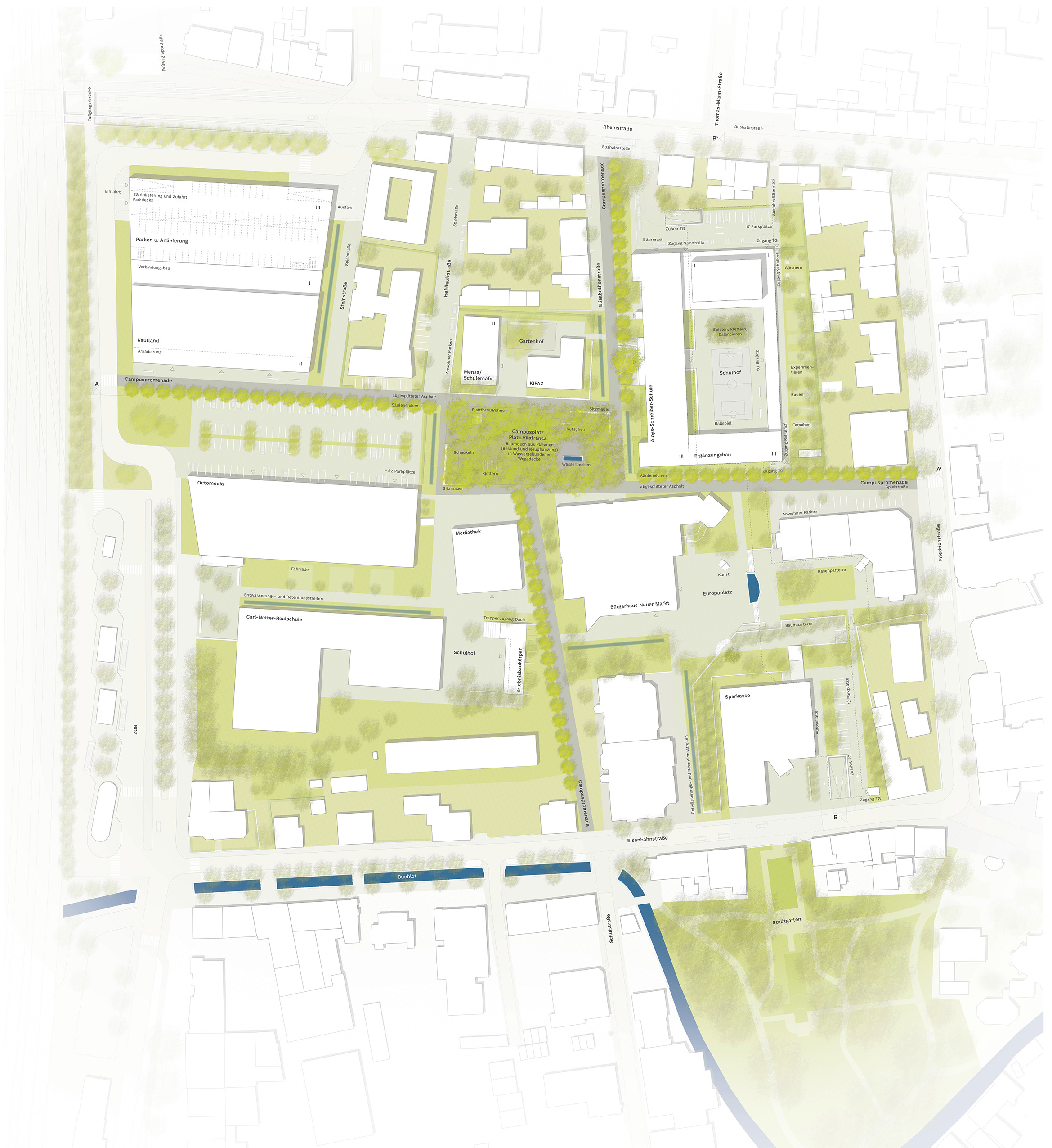 Die neue Grüne Mitte, der „Grüne Campus“, steht im Kontrast zur städtisch-harten Ortsmitte in unmittelbarer Nachbarschaft. Die Gebäude mit den öffentlichen Nutzungen wie Schulen, Mediathek, Bürgerhaus, aber auch die kommerziell genutzten Gebäude wie Kaufland und OCTOMEDIDA wirken künftig wie zufällig eingestreute Objekte innerhalb des „Grünen Campus“.