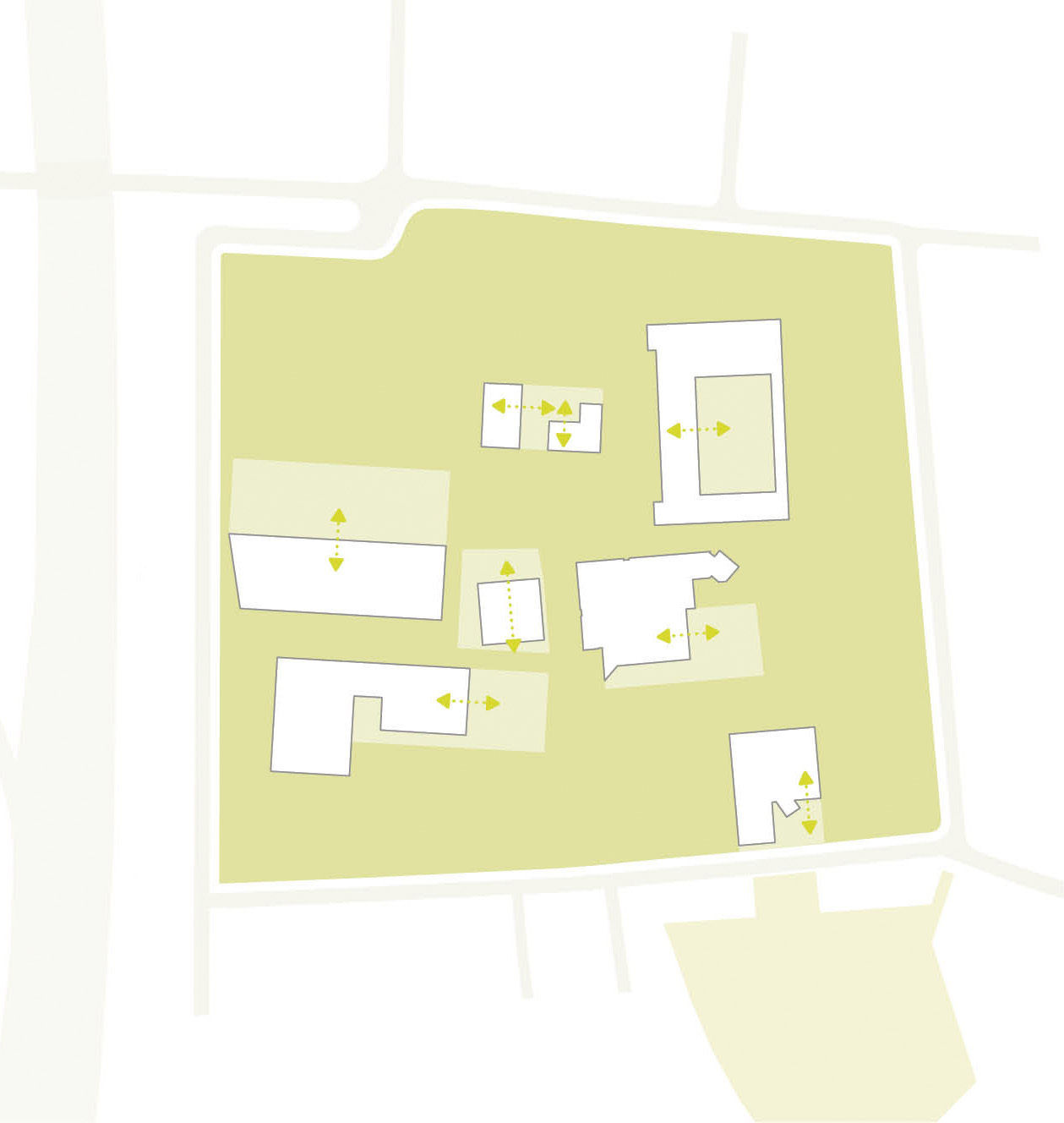 Das heterogene Quartier wird durch den Gedanken eines „Grünen Campus“ zusammengefasst und vom Autoverkehr befreit.
