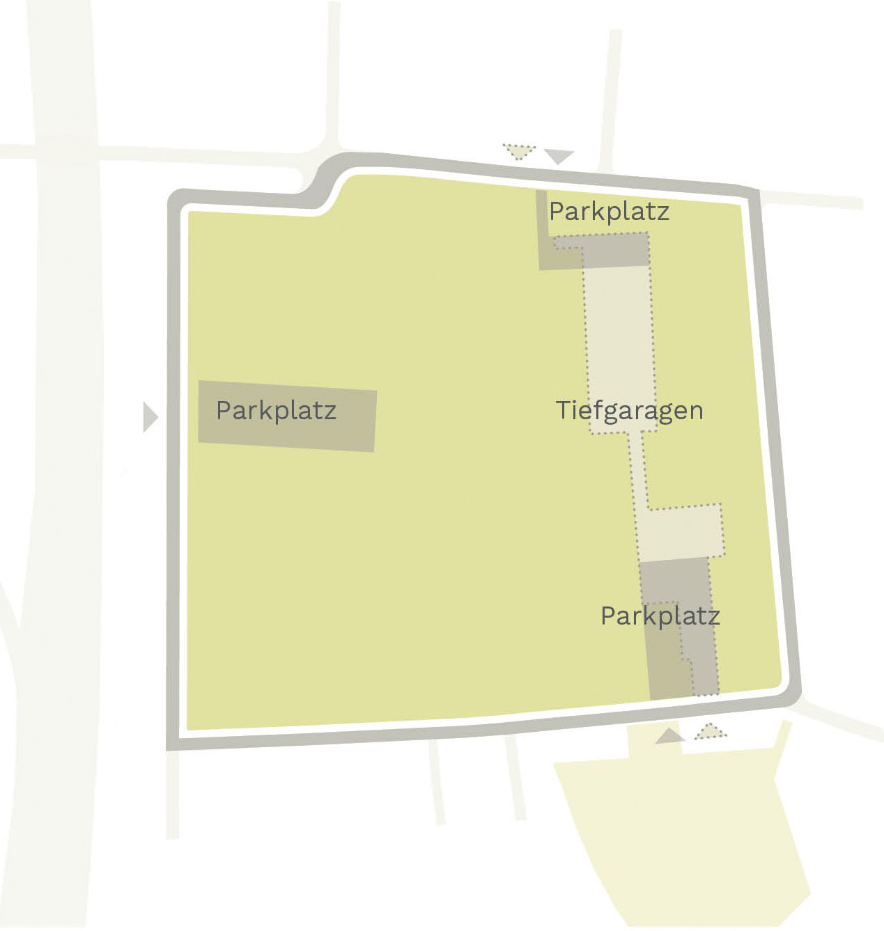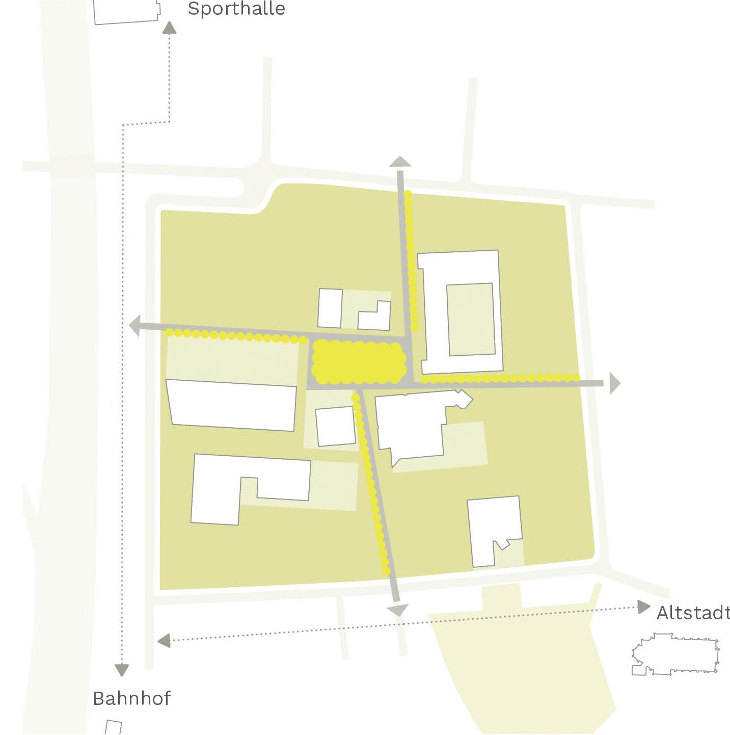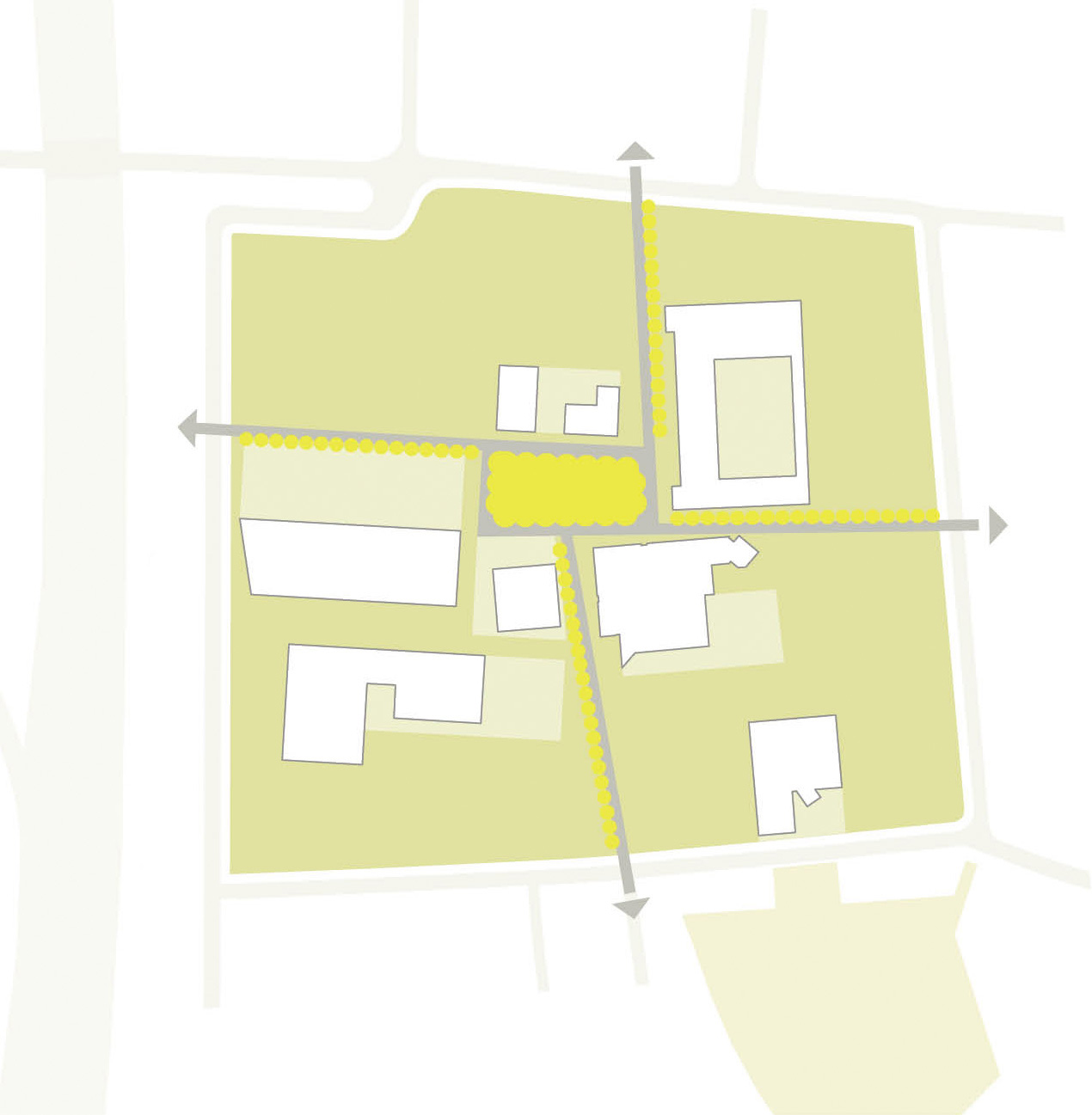 Die übrigen Wege und Plätze werden redimensioniert, um dem Grün des „Grünen Campus“ mehr Bedeutung zukommen zu lassen.